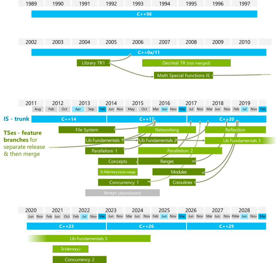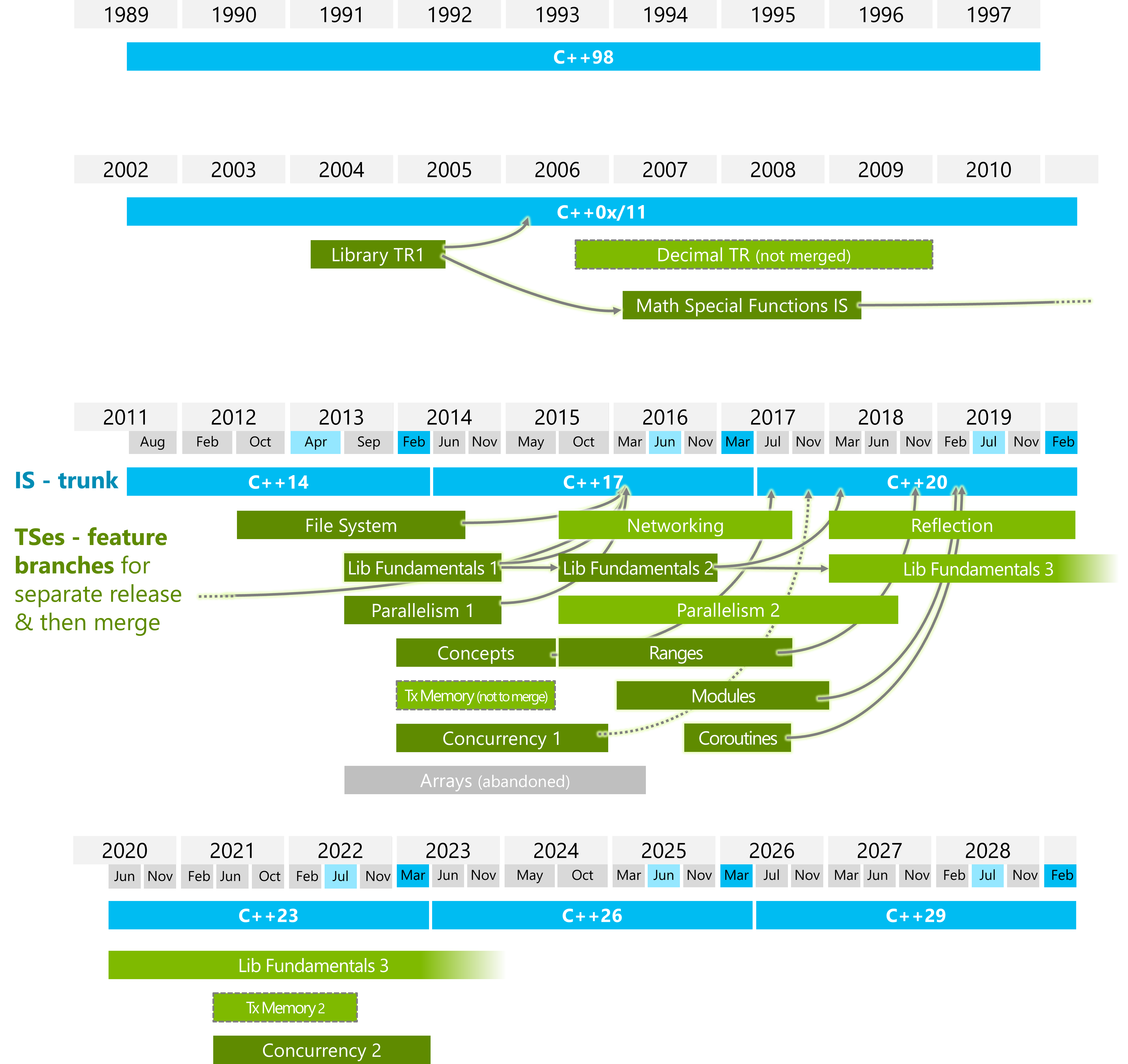 Starting in 2012, the committee has transitioned to a "decoupled" model where major pieces of work can progress independently from the Standard itself and be delivered in "feature branch" TSes. Vendors can choose to implement these, and the community can gain experience with the std::experimental version of each feature. This lets us learn and adjust each feature's design based on experience before it is cast in stone when merged into the "trunk" C++ Standard itself. In the meantime, the Standard can be delivered on a more regular cadence with smaller and more predictable batches of features. This approach also helps C++ compilers to track the Standard more closely and add both the experimental and the draft-final C++ features in a more consistent order. The current schedule is in paper P1000.