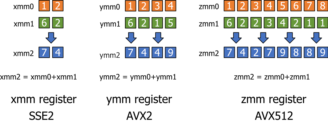 SIMD is a parallel computing technology that allows processors to perform the same operation on multiple data elements simultaneously. By using SIMD instructions, a single CPU instruction can operate on multiple data elements in a single clock cycle. For example, with 256-bit SIMD registers, it is possible to process eight 32-bit floating-point numbers or sixteen 16-bit integers in parallel. This leverages the data-level parallelism inherent in many algorithms, such as mathematical computations, image processing, audio processing, and simulations. Figure 1 illustrates the element-wise addition of two sets of numbers using the SSE2, AVX2 and AVX512 instructions sets.